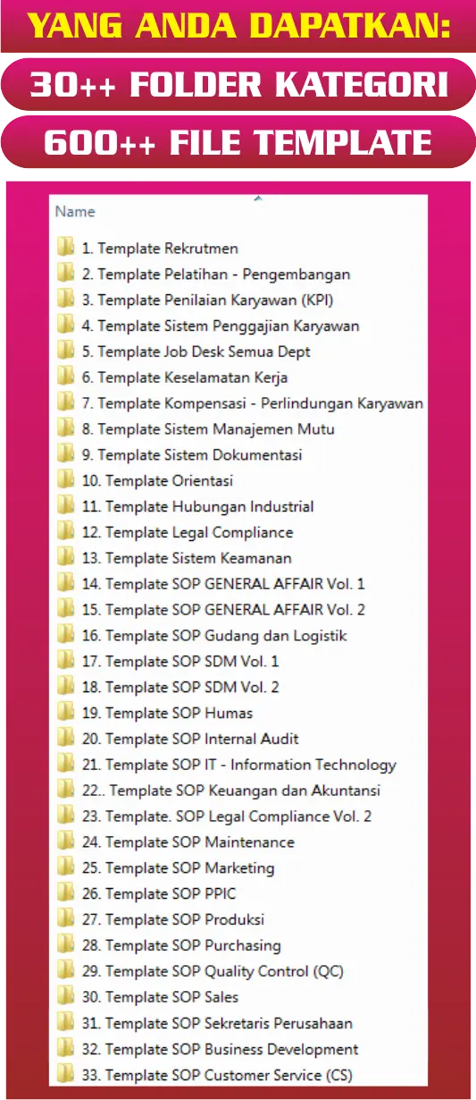 Masing-masing Kategori Folder berisi hingga puluhan File Template dengan format Microsoft Word serta beberapa file pendukung Excel dan Powerpoint dengan jumlah Total 600++ file yang dapat Anda gunakan sesuai kebutuhan Anda maupun Perusahaan Anda.